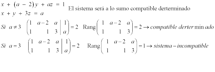 Lo primero que he hecho ha sido hacer el determinante y me da 0. De ahí deduzco que es un SCI o SI. Calculo el rango de la matriz A y me da 2, calculo la de la ampliada y me da 3. Por lo tanto, es un SI, porque el rango de la ampliada es distinto de la normal.