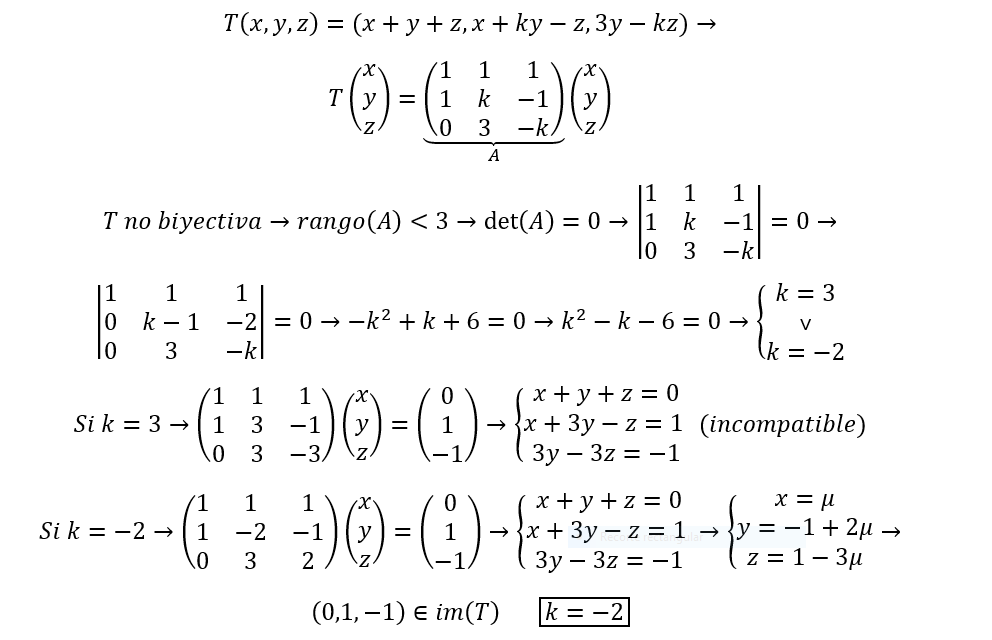Hallar el valor de k para que T no sea biyectiva y (0,1,-1) pertenezca a la imagen