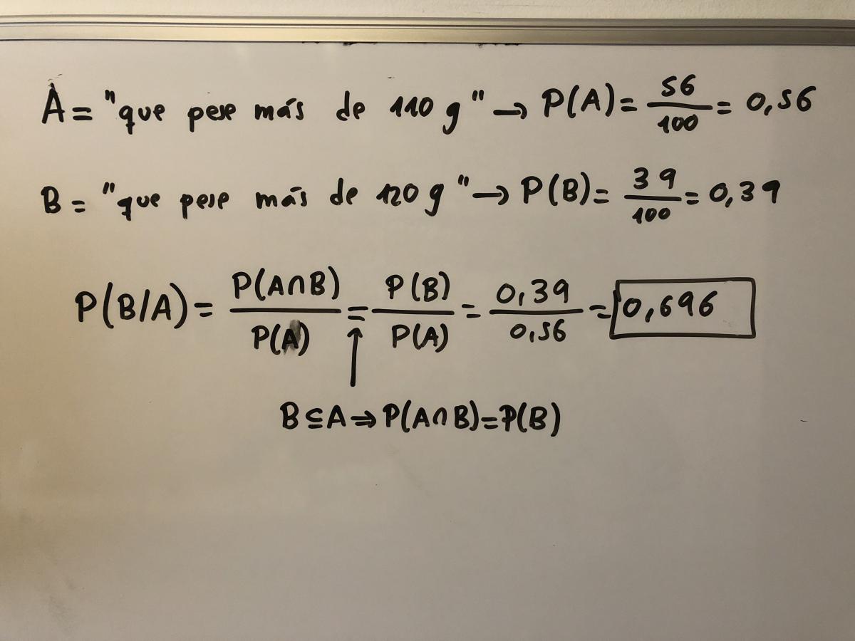 Se tienen paquetes de harina de diferentes pesos. Se sabe, por ejemplo que, el 56% de los paquetes pesa más de 110 gramos y el 39% pesa más de 120 gramos. Si elegimos un paquete de entre los que pesan más de 110 gramos, cuál es la probabilidad de que pese más de 120 gramos? Solucion: 0,696