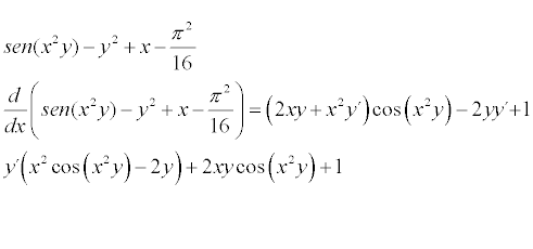 y ' = ( -1 - 2x*y*cos(x2*y) ) / (x2*cos(x2*y) - 2y), con la condición: x2*cos(x2*y) - 2y ≠ 0.