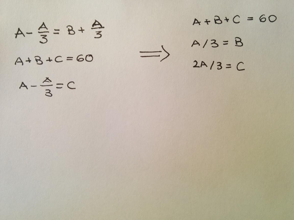 A + (1/3)A + (2/3)A = 60, multiplicas por 3 en todos los términos de la ecuación, y queda:
