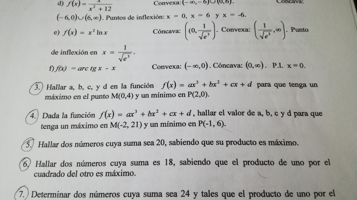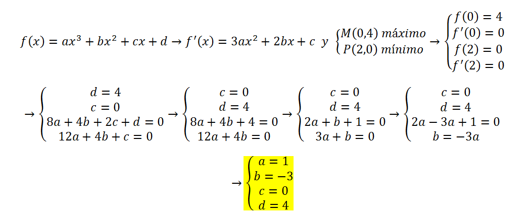Buenas tardes, no sé como resolver el ejercicio 3. Con el punto M he averiguado que d=4, y luego con el punto P he sustituido en f´(x)=3ax2 + 2bx +c y me queda que 12a+4b+c=0 ecuación 1. Y ahí me he quedado. Gracias de antemano por la ayuda