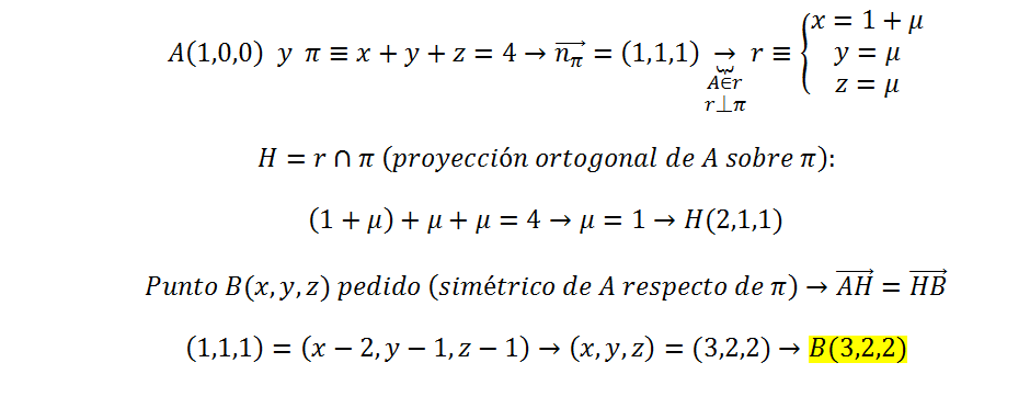 El punto M(2, 1, 1) es el punto medio del segmento AA’, se tiene pues: