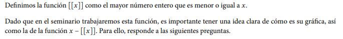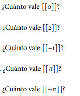 Aplicando la definición: Por ejemplo [[0]] es el mayor entero menor o igual a 0. Está claro que es el 0. Cuando el número x es entero [[x]] = x. Si x no es entero, x está entre dos enteros consecutivos n y n+1, entonces el mayor entero menor que x es n. Así π = 3,14, está entre 3 y 4, por tanto [[ π]] = 3. - π=-3,14 está entre -4 y -3 entonces el mayor entro menor que - π es -4, por tanto [[ -π]] = -4