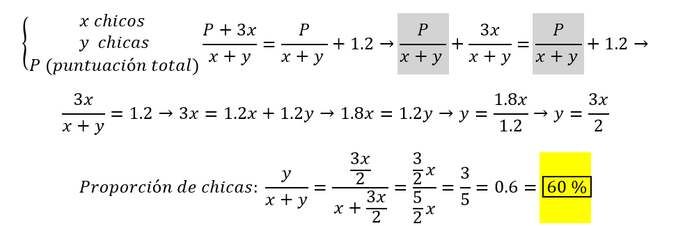 Cierta clase realiza un test.Si cada chico obtuviera 3 puntos mas en dicha prueba la media de toda la clase aumentaría en 1,2 puntos.Obten el porcentaje de chicas de dicha clase.