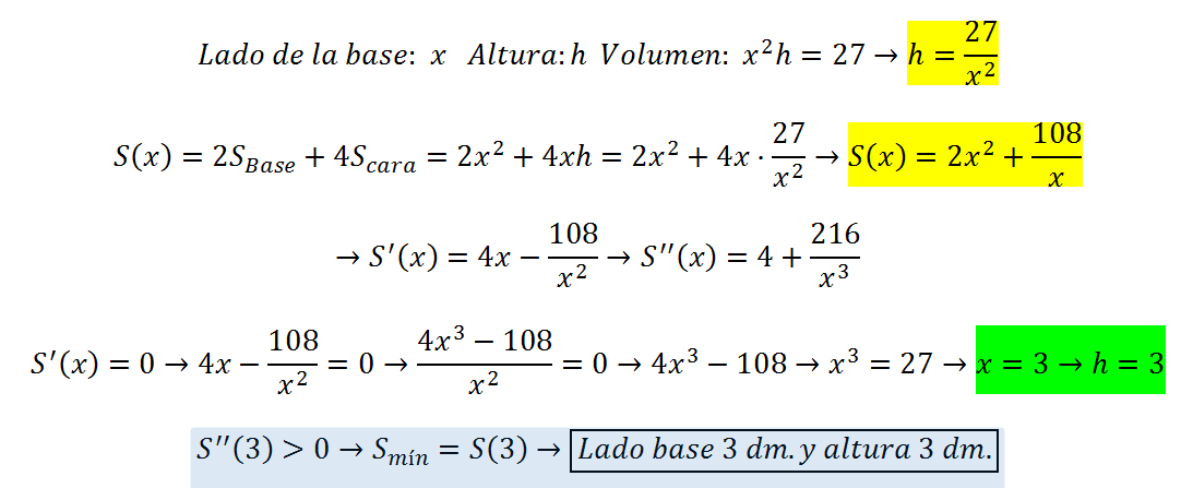 Buenas, me podeis ayudar con este ejercicio; Se desea construir una caja cerrada con forma de prisma rectangular con base cuadrada, de modo que el volumen sea 27 dm^3.Obtener las dimensiones para que la superficie de la caja sea minima. Graciaaas
