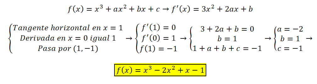 Buenas, me pueden ayudar con este ejercicio: Halla a, b y c en f(x) = x^3 + ax^2 + bx + c de modo que la gráfica de f(x) tenga tangente horizontal en x=1, su derivada en x=0 valga 1 y pase por el punto (1,-1). Graciaaas