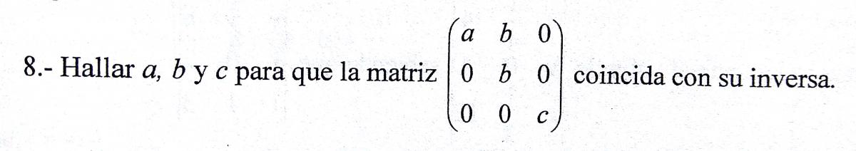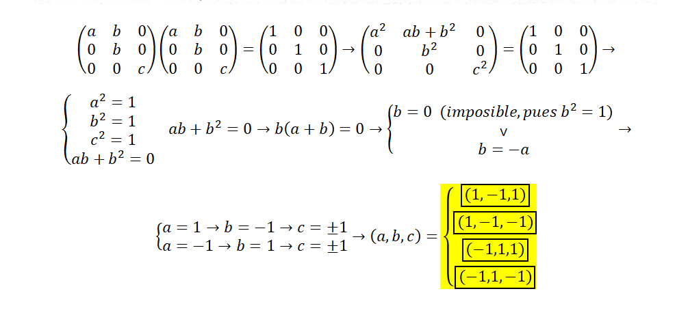 He multiplicado la matriz por sí misma y el resultado lo he igualado con la matriz identidad, pero todas las incógnitas tienen dos soluciones posibles (excepto la b que tiene 3). He probado con la calculadora online de matrices y me salen dos soluciones posibles: a = 1, b = -1, c = 1 y a = 1, b = -1, c = -1. El problema es que no sé cómo escoger las combinaciones correctas sin comprobarlo, supongo que debe de haber alguna manera para saber qué soluciones son las correctas.