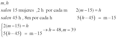 En una reunión hay hombres y mujeres. Se van 15 mujeres y quedan 2 hombres por cada mujer. A continuación se van 45 hombres y entonces quedan 8 mujeres por cada hombre. Cuántas mujeres participaban inicialmente en el congreso?
