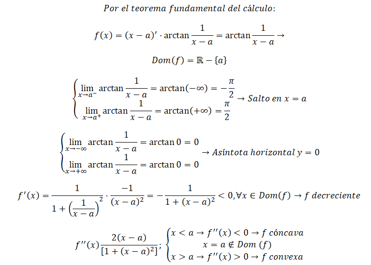 f(x) = arctan( 1/(x-a) ), cuyo dominio es: D = R - {a} = (-∞,a) u (a,+∞).