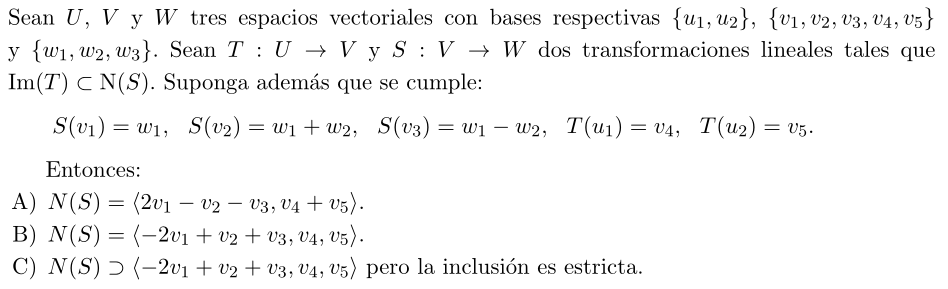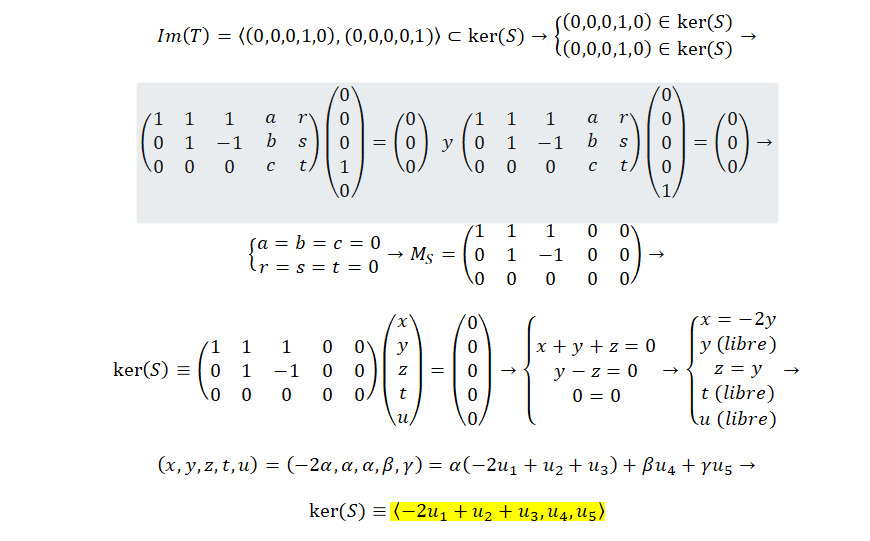 Para hallar el núcleo de S, tendría que hacer la combinación lineal entre los S(v1), S(v2), S(v3) dados hallando las coordenadas para que dé 0 de tal forma que entre esos 3 vectores pueda encontrar el núcleo, por otro lado ya tengo que T(u1), T(u2) ya son parte del núcleo, pero ¿no podría haber otro elemento más en el núcleo?