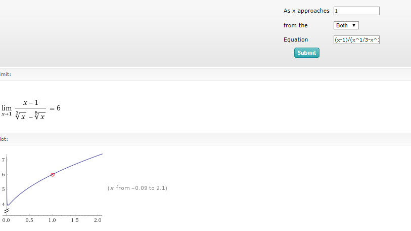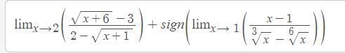 lim(x→2) ((√(x+6)-3)/(2-√(x+1))) + sgn ( lim(x→1) ((x-1)/(∛(x)-6√(x)) ) = -0.64031868764 + sgn ( 6 ) = -0.64031868764 + 1 = 0.35968 <----Solución