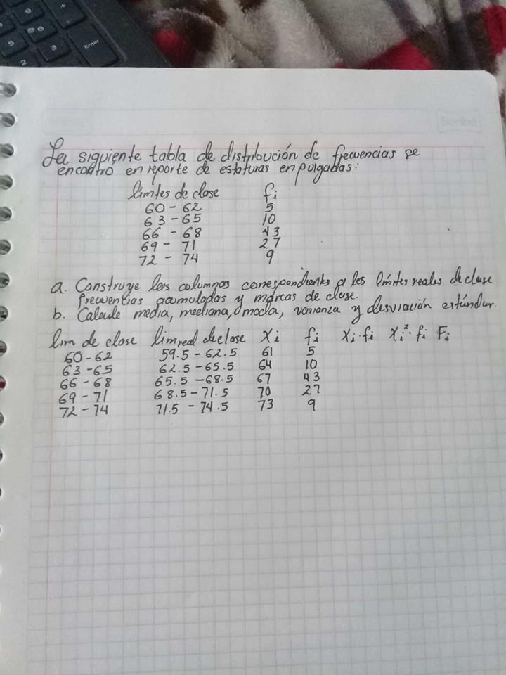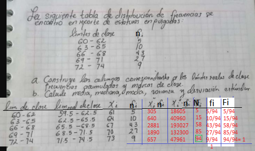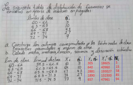 Media=(∑ki=1xi*ni)/n = (305+640+2881+1890+657)/94 ≈ 67.8 pulgadas.