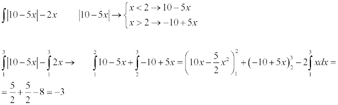 I = 1∫3 (|10 - 5*x| - 2*x)*dx, descompones como suma de integrales, y queda: