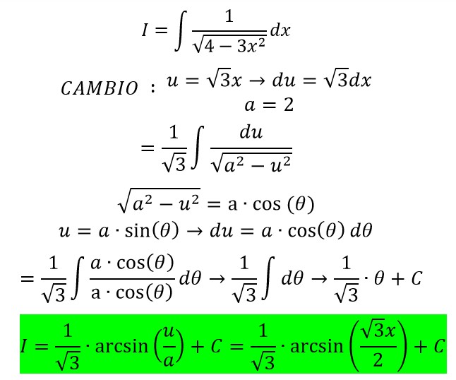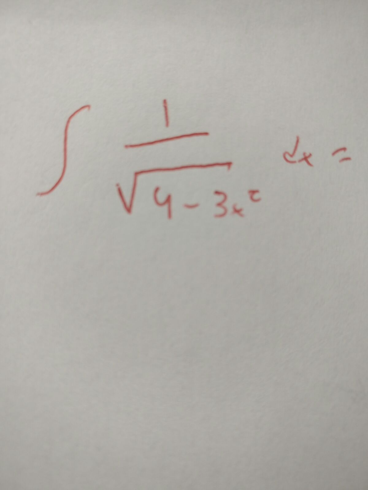 I = ∫ ( 1/√(4 - 3x2) )*dx, sustituyes expresiones, y queda: