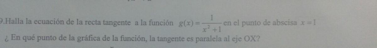 Plantea la pendiente de la recta tangente: m = g ' (1) = -2(1)/(12+1)2 = -2/(1+1)2 = -2/22 = -2/4 = -1/2.