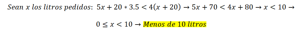 Inecuaciones en 4º de ESO. ¿Cuántos litros de vino de 5€ han de mezclarse con 20 litros de otro a 3,5 € para que el precio de la mezcla sea inferior a 4 €/litro?.