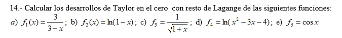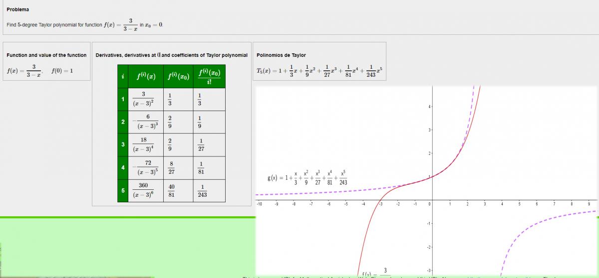 f(0)(x) = 3/(3-x) = 3*(3-x)-1 = 3*0!*(3-x)-1,que evaluada en el centro de desarrollo queda: f(0)(0) = 0! = 0!/1 = 0!/30;