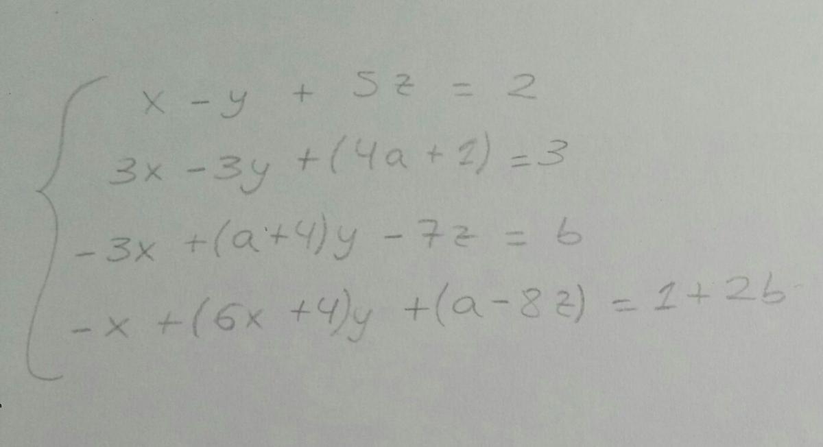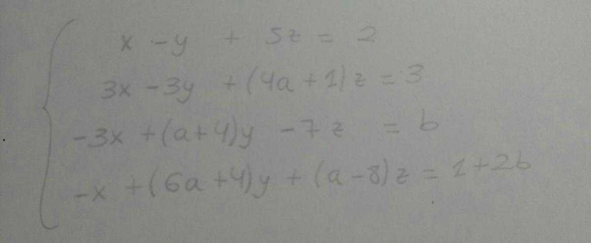 Tengo el siguiente sistema de ecuaciones lineales que depende de los parámetros a y b. Me piden discutir en función de esos parámetros y resolver el sistema para a=0 y b=3