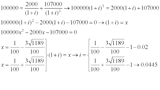100000 = 2000/(1+i) + 107000/(1+i)^2