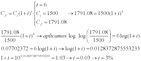1791,08 = 1500*(1 + i)6, haces pasaje de potencia como raíz, y queda: