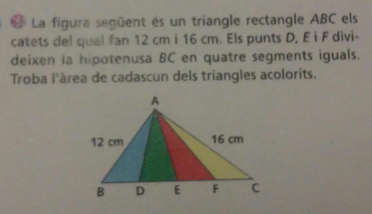 Alguien sabría calcular el Área de cada triángulo pequeño, sabiendo que el triángulo grande ABC es rectángulo y que los puntos D, E y F dividen la hipotenusa BC en 4 partes iguales?