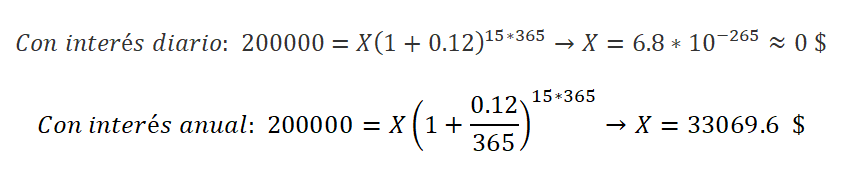 Hallar la cantidad que es necesario disponer en un inversión que paga el 12% de interés nominal diario con capitalización diaria, para disponer de $. 200,000 al cabo de 15 años.