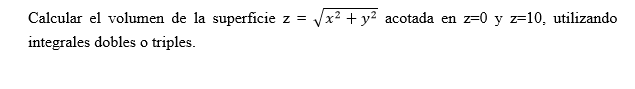 V = ∫∫B ( 10 - √(r2) )*r*dr*dθ = ∫∫B (10 - r )*r*dr*dθ = ∫∫B (10*r - r2 )*dr*dθ = integras para r = ∫ [5*r2 - r3/3]*dθ = resuelves para r: