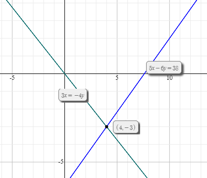 Buena noche eh esque estoy un poco confundido esque tengo que hacer esta ecuacion  3x= - 4y y 5x - 6y = 38 pero desarrollándola con el metodo grafico y pues nose como hacerla porque falta un valor y nose tampoco como hallarlo
