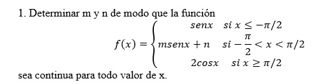 Segundo, aplicas limite lateral en esos puntos. Cuando tengas los resultados de los limites laterales de un punto (por ejemplo -1/2π), los igualas, ya que aunque el enunciado no te lo diga, la funcion es continua, es decir que los limites laterales son iguales. Debe serlo por que sino no tendrias ninguna posibilidad de encontrar m y n.