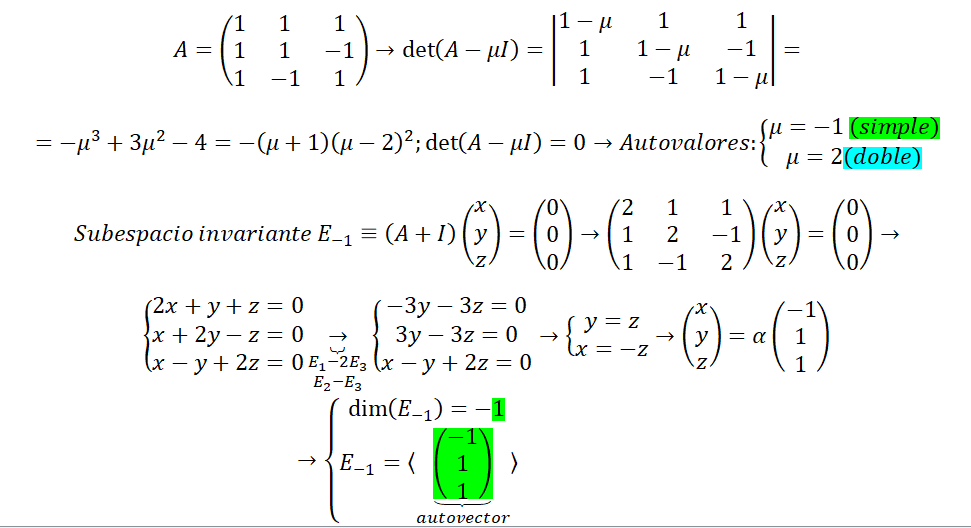 1 1 -1 Resuelvo el determinante y me da( no sé si estará bien) -λ3- λ2 -4 que factorizando por ruffini me dió (λ-2)(λ2+λ+2)