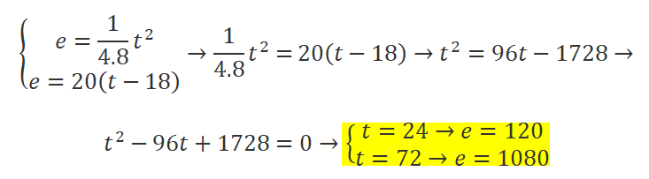 ¿Me podrías ayudar un un sistema de ecuaciones? Sería, e=1/4'8 * t^2 y e=20 (t-18)