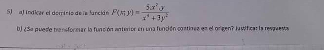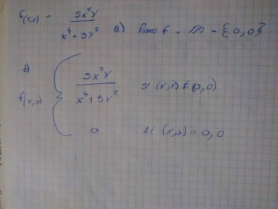 no, el dominio no son todos los reales, por que estamos hablando de una funcion con dominio en el plano. a exepcion del origen del cordenadas. para justificarlo bien. en todo caso con los limites parciales, pero tampoco alcanza ese criterio, es muy complicado para demostrarlo, lo mas facil con alguna funcion que pase por ese punto, pero es mucho desarrollo para poder escribirlo por aqui :( lo siento