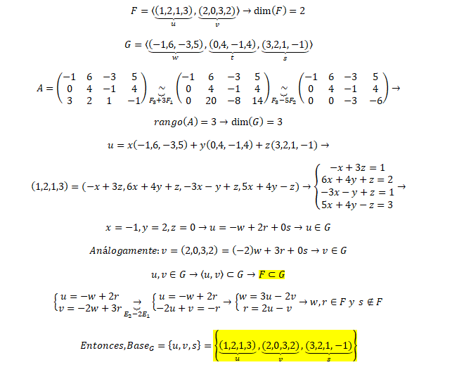 en R4 consideramos el subespacio vectorial F generado por los vectores (1, 2, 1, 3) y (2, 0, 3, 2), y el subespacio G generado por (-1, 6, -3, 5), (0, 4, -1, 4) y (3, 2, 1, -1). Compruebe que F ⊂ G, y ampliar una base de F hasta obtener una base de G.