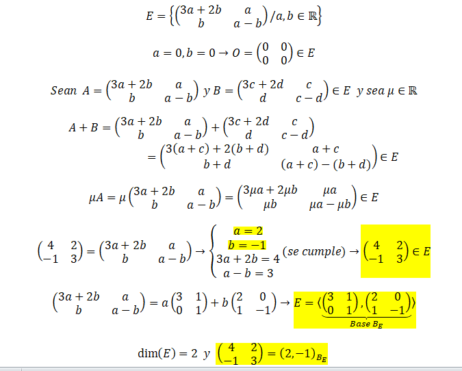 Es un subespacio vectorial de M2 (ℛ). Hallar la dimensión de E y una base. Sea la matriz A=(4 2)