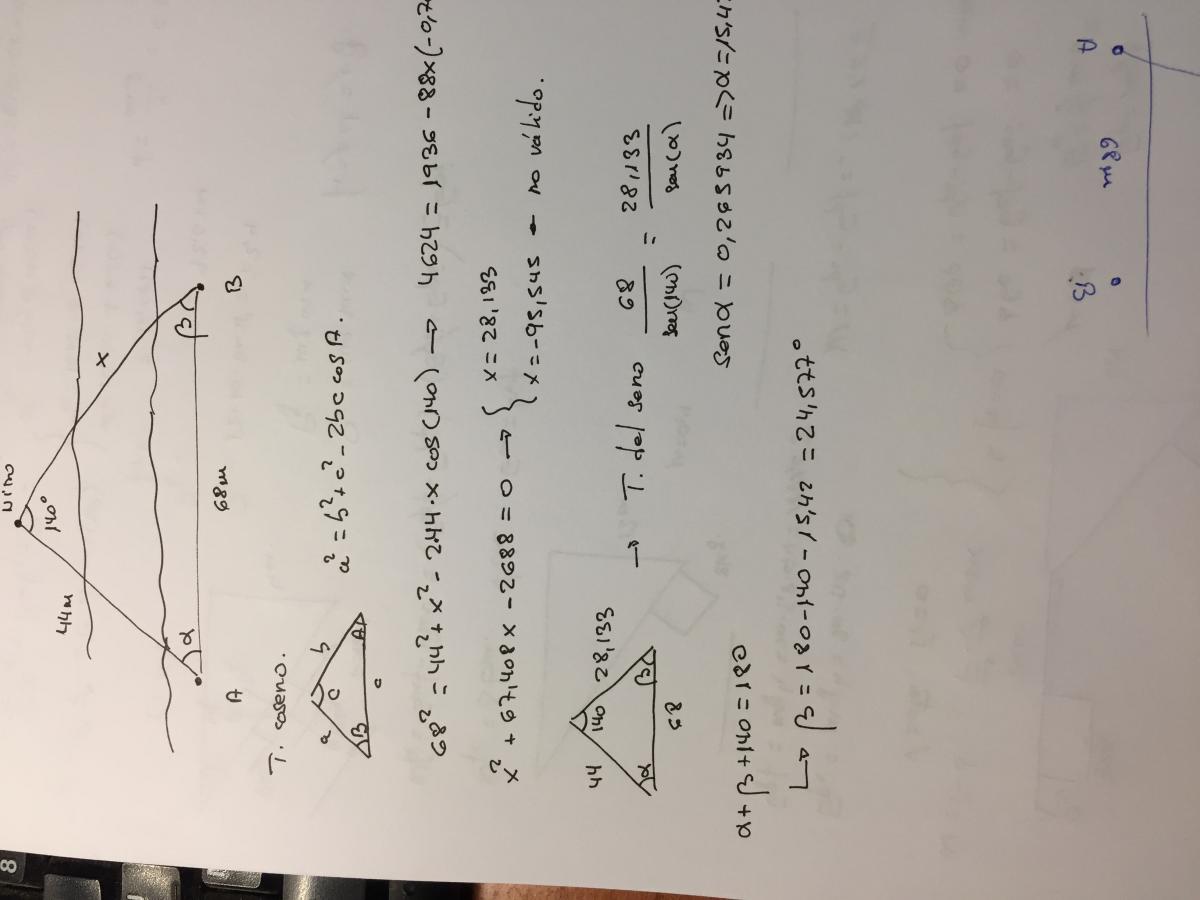 Dos individuos , distantes entre sí 68 m y situados en la misma orilla de un río, observan un nido en la copa de un roble, situado en la orilla opuesta. Uno de los individuos sabe que dista 44 m del nido y también que, desde éste, las visuales a ambos observadores forman un ángulo de 140º. Determina los restantes elementos del triángulo que se forma.