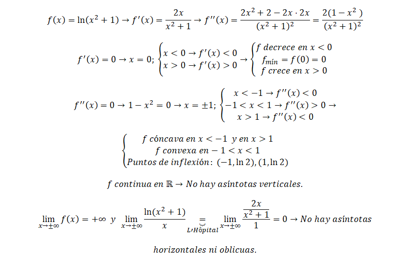 luego, tienes que la gráfica de la función presenta inflexiones en: x = -1, y el valor de la función para él es: f(-1) = ln(2), y en x = 1, y el valor de la función para él es: f(1) = ln(2).