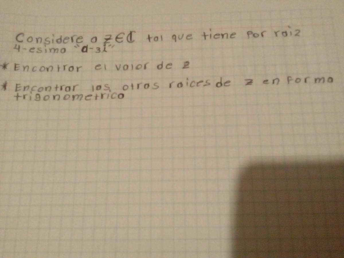 Considere a Z en los complejos, tal que tiene por raiz 4-esima "a-3i", encuentre a Z las otras raices n-esimas en forma polar