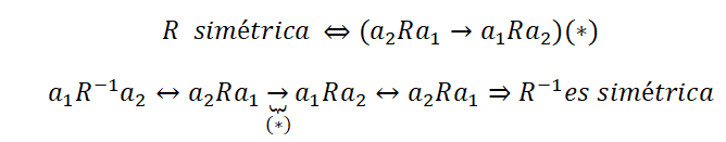 luego, por las proposiciones señaladas (*) (**) tienes que la relación inversa R-1 es simétrica.