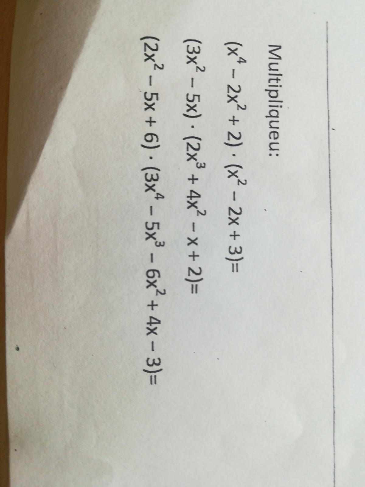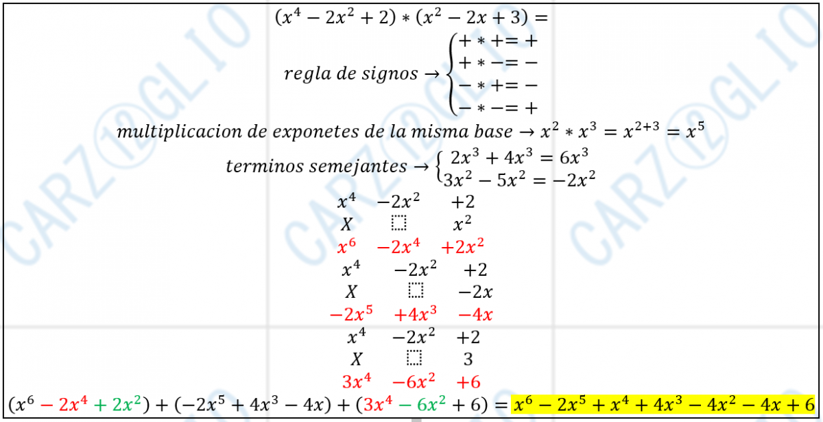 Multiplica a cada uno de los factores comunes por cada término del cuatrinomio (recuerda que debes multiplicar los coeficientes y sumar los exponentes de la variable, en cada producto), lo haces, y queda: