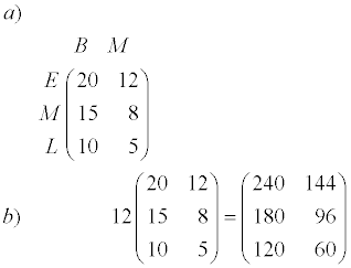 Una compañía de muebles fabrica butacas, mecedoras y sillas, y cada una de ellas de tres modelos: E (económico), M (medio) y L (lujo). Cada mes produce 20 modelos E, 15 M y 10 L de butacas; 12 modelos E, 8 M y 5 L de mecedoras, y 18 modelos E, 20 M y 12 L de sillas. Representa esta información en una matriz y calcula la producción de un año.