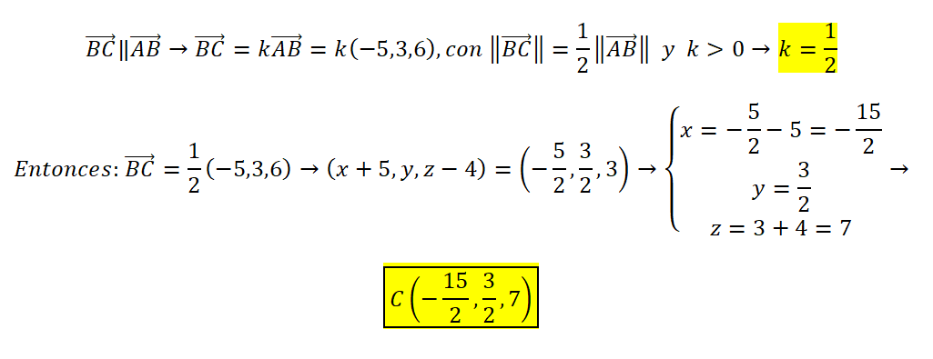 Dados los puntos A(0,-3,-2) B(-5,0,4) C(x,y,z). Determine las coordenadas de C para que el vector →BC sea paralelo al vector →AB, del mismo sentido y tenga la mitad de su modulo(norma, magnitud.)