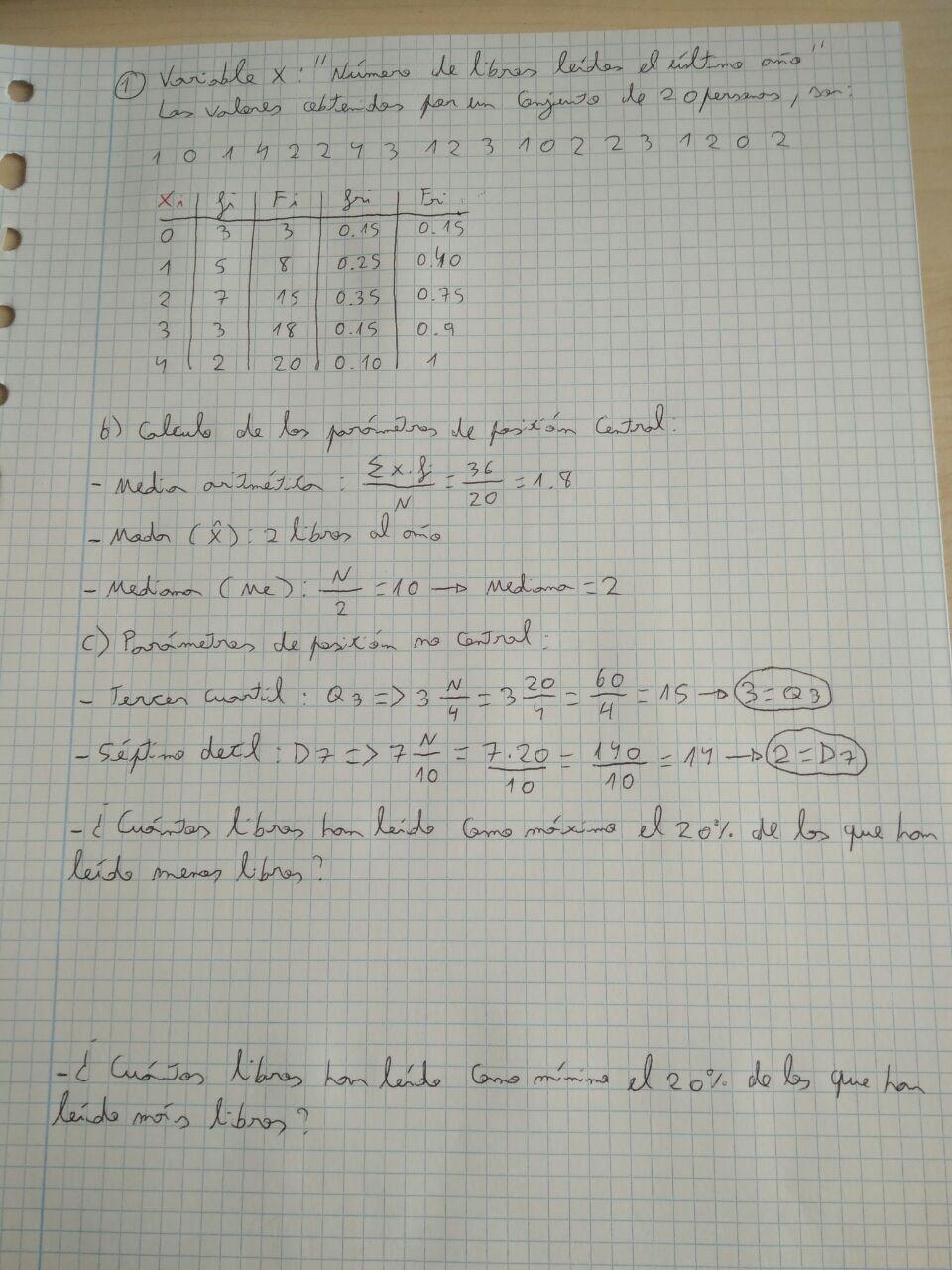 Hola buenas, no consigo resolver este ejercicio. En las dos últimas preguntas donde pone "¿Cuántos libros han leído como máximo el 20% de los que han leído menos libros?" y "¿Cuántos libros han leído como mínimo el 20% de los que han leído más libros?" Alguien me puede ayudar? Gracias.