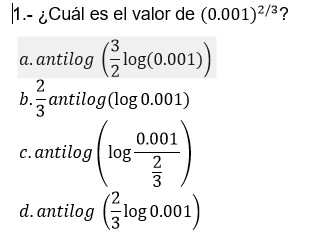 x = antilog( (2/3)*log(0,001) ), por lo que la opción d es la respuesta correcta.