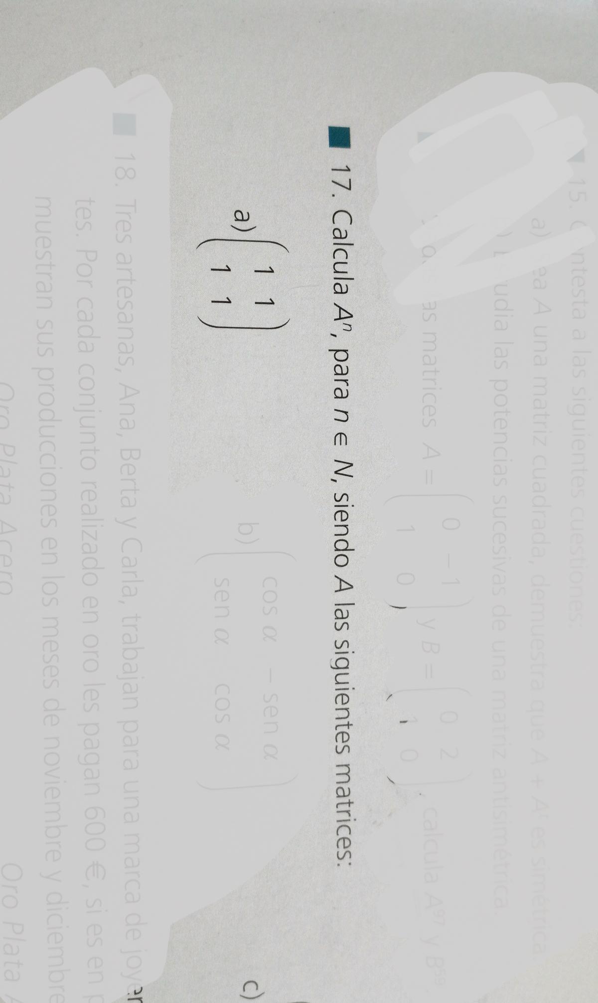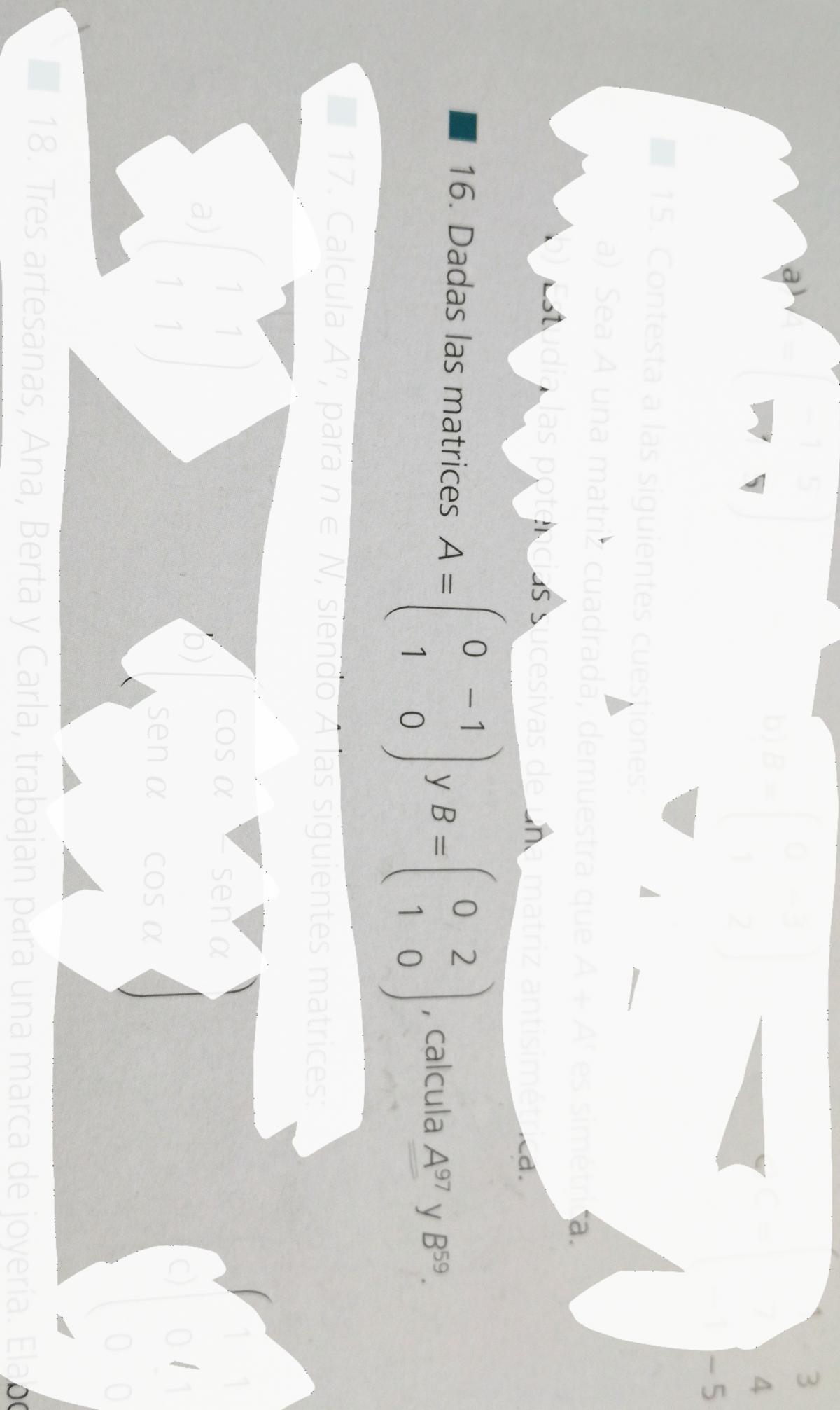 No sé como seguir este ejercicio de matrices, en primer lugar voy a mandar una foto del enunciado y después de lo que yo he hecho y no sé continuar. Yo sólo quiero el apartado B 59