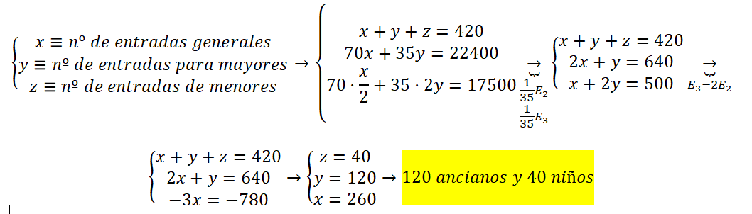 Por lo tanto, tenemos un sistema de tres ecuaciones y tres incógnitas que se resuelve y ya tenemos las respuestas, las cuales son 120 personas mayores de 65 y 40 menores de 12 años