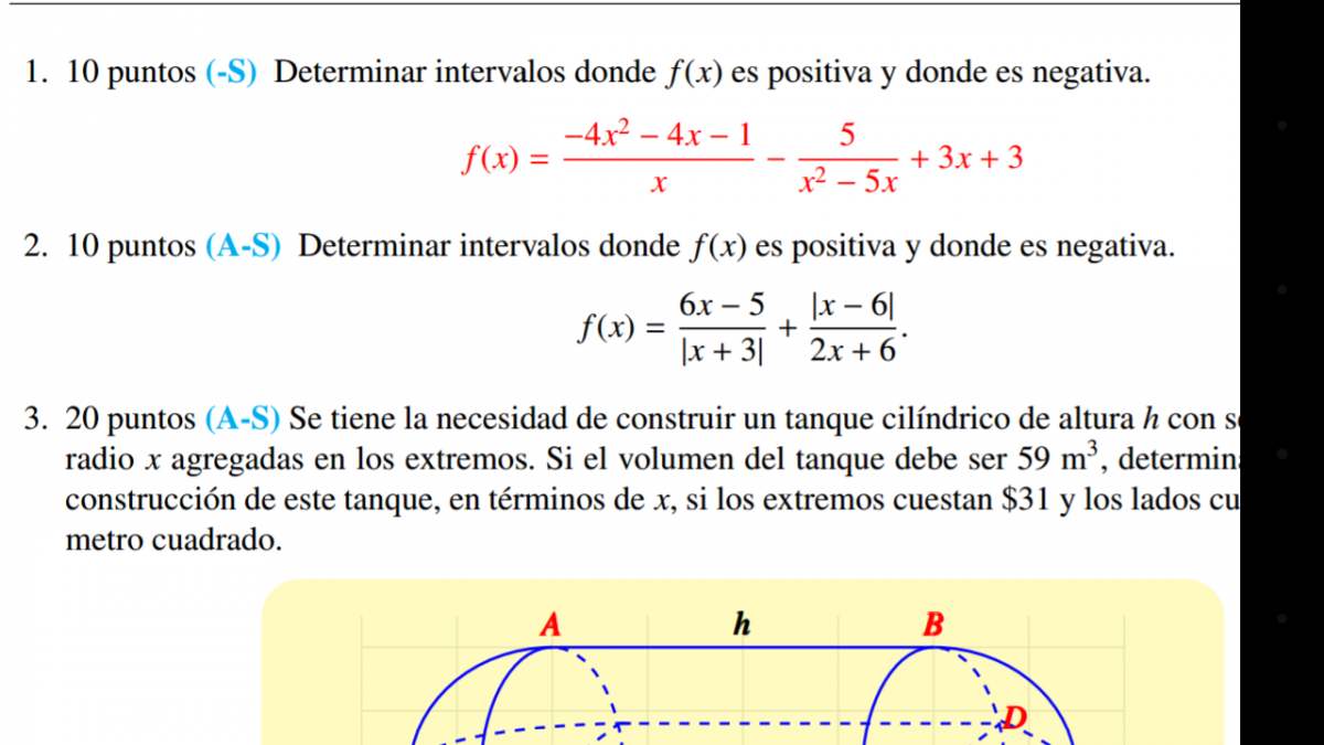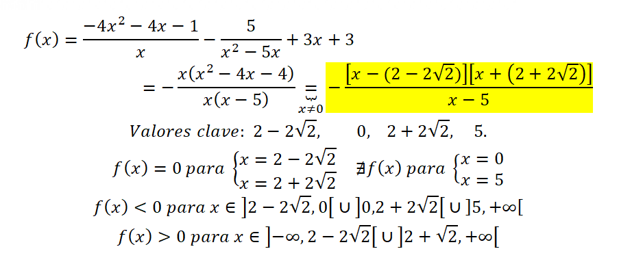 Luego, con los cuatro valores remarcados (los dos primeros que no pertenecen al dominio de la función, y los dos últimos que son raíces), tienes cuatro intervalos, en los que debes elegir un representante a fin de determinar el signo de la función en cada subintervalo: