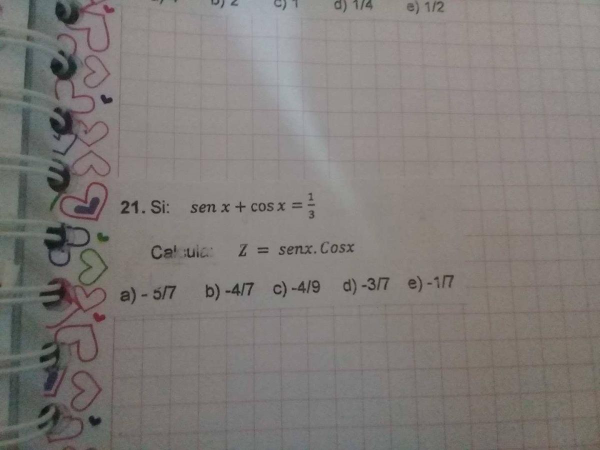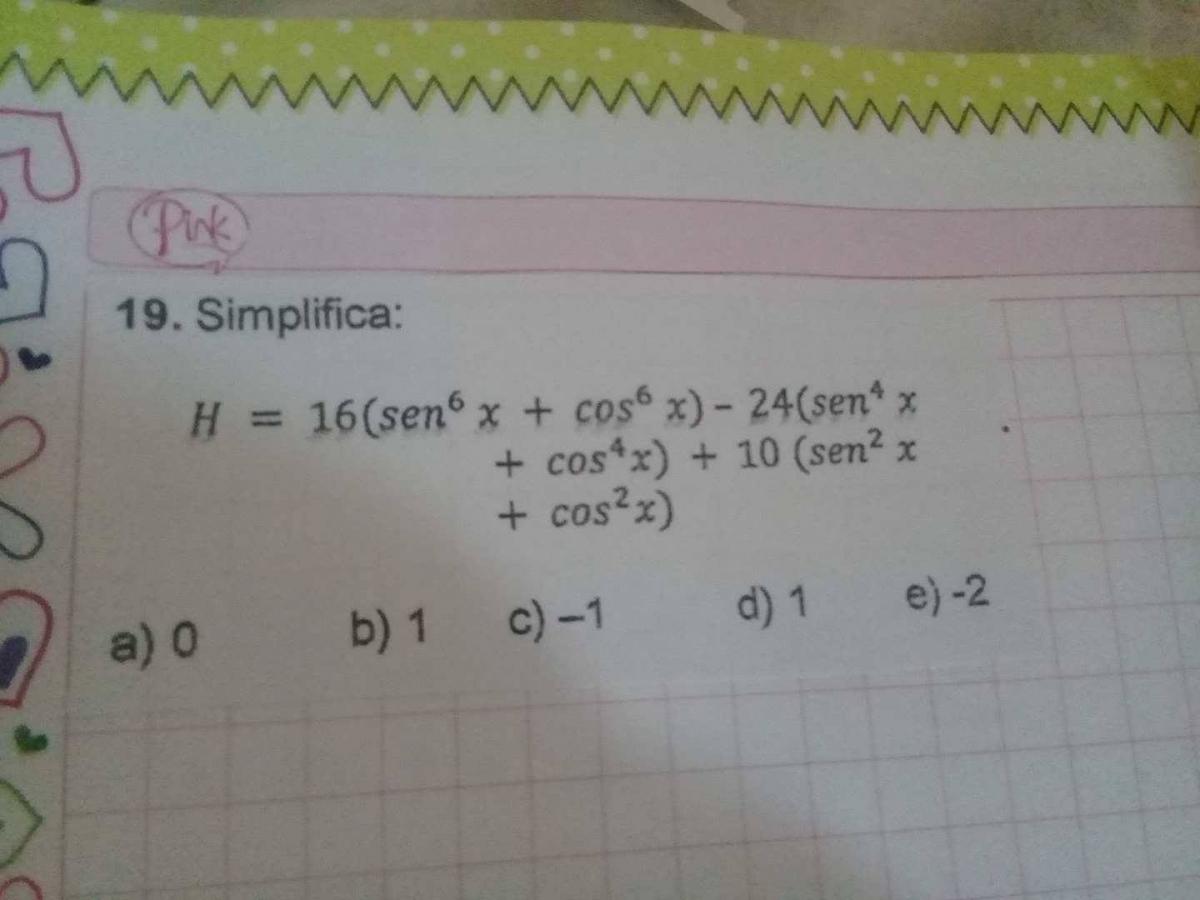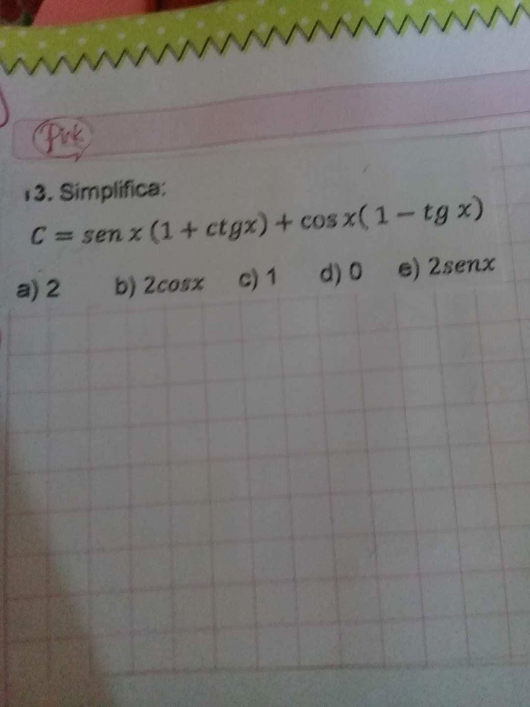 2. Comprueba si hay algún sen2x+cos2x , tienes que reemplazarlo por el número 1; porque sen2x+cos2x=1 (aunque no se dio el caso, en otros ejercicios similares puedes encontrarte con que necesites saber alguna de las otras razones trigonométricas)