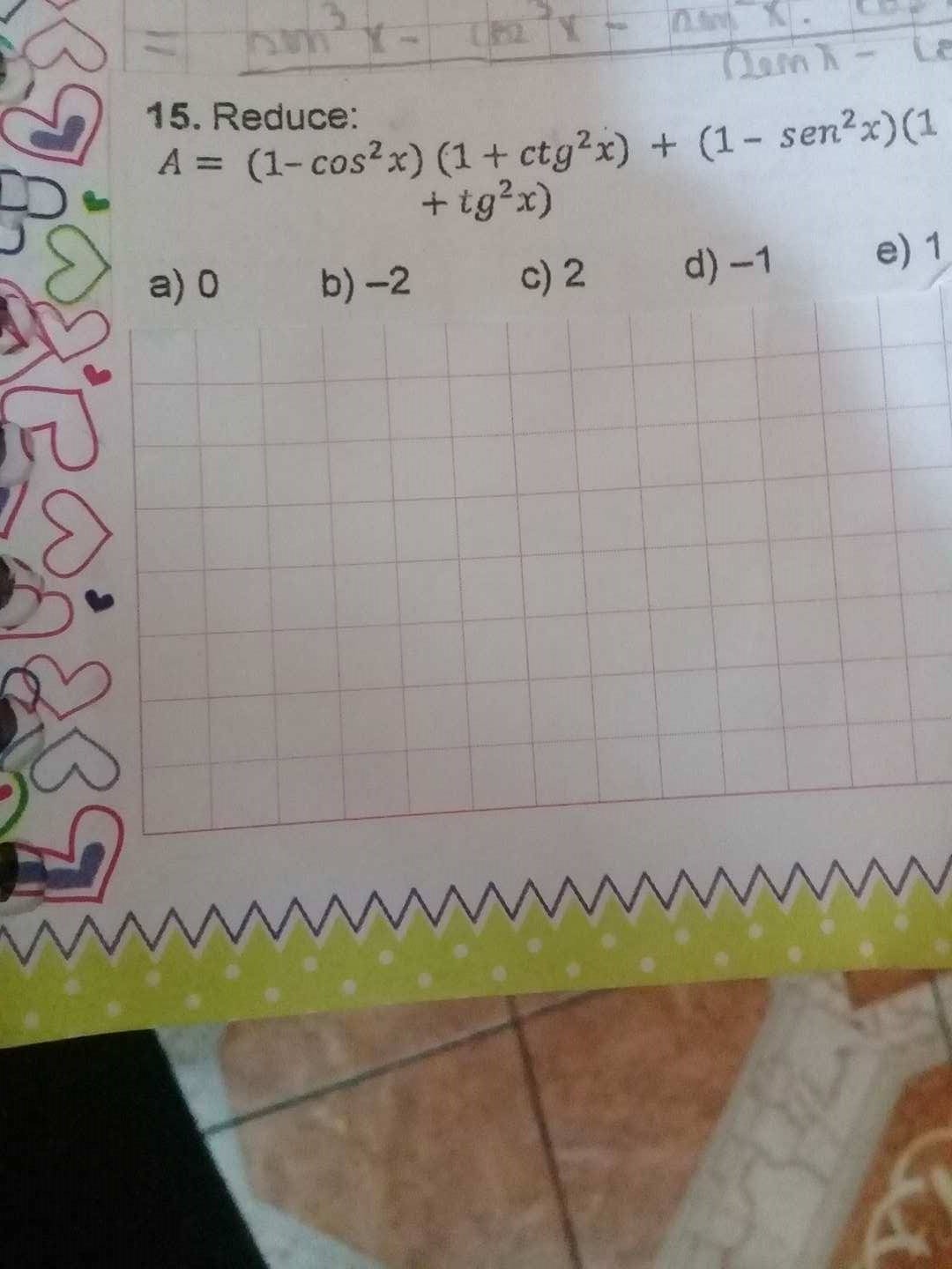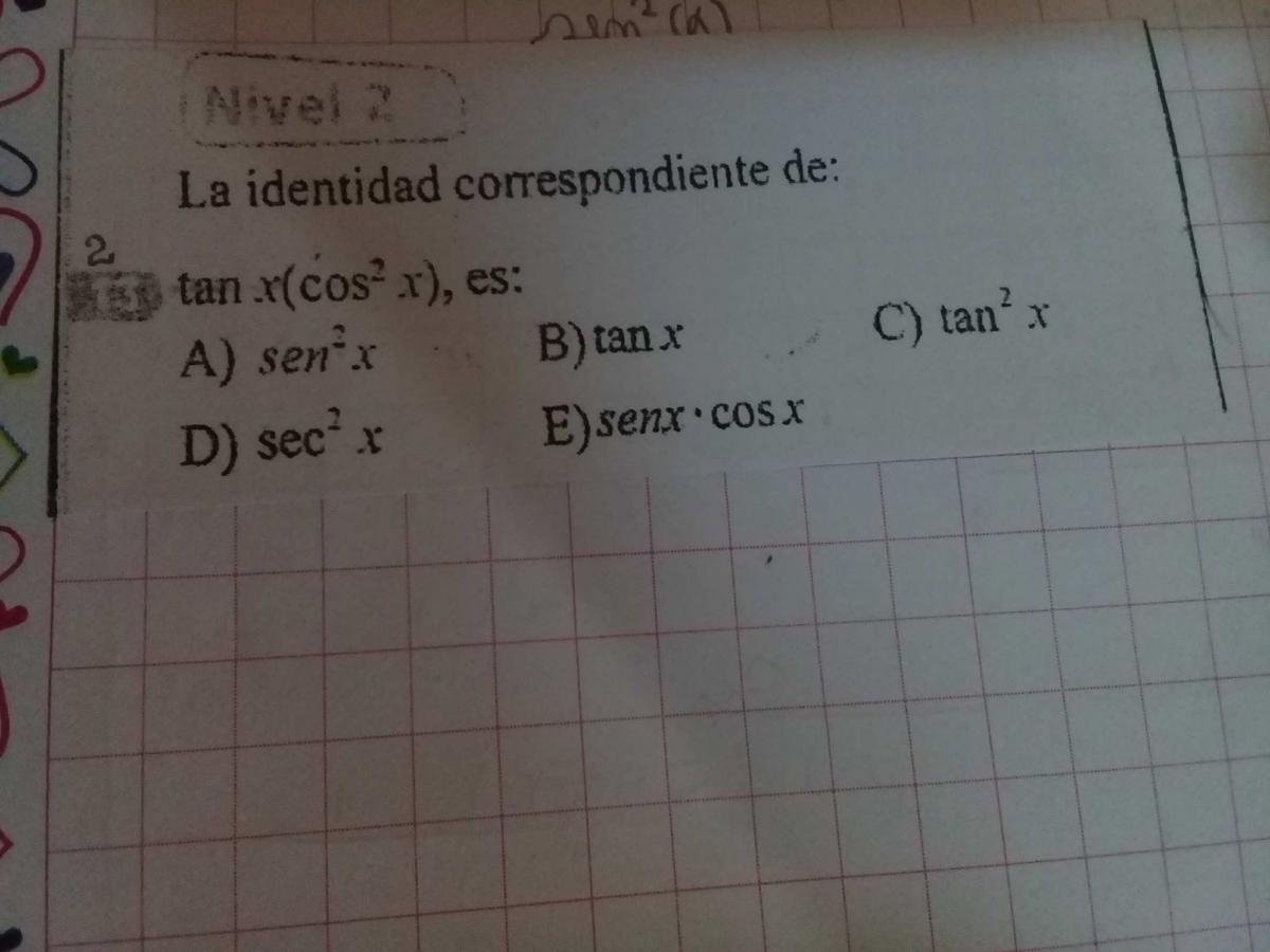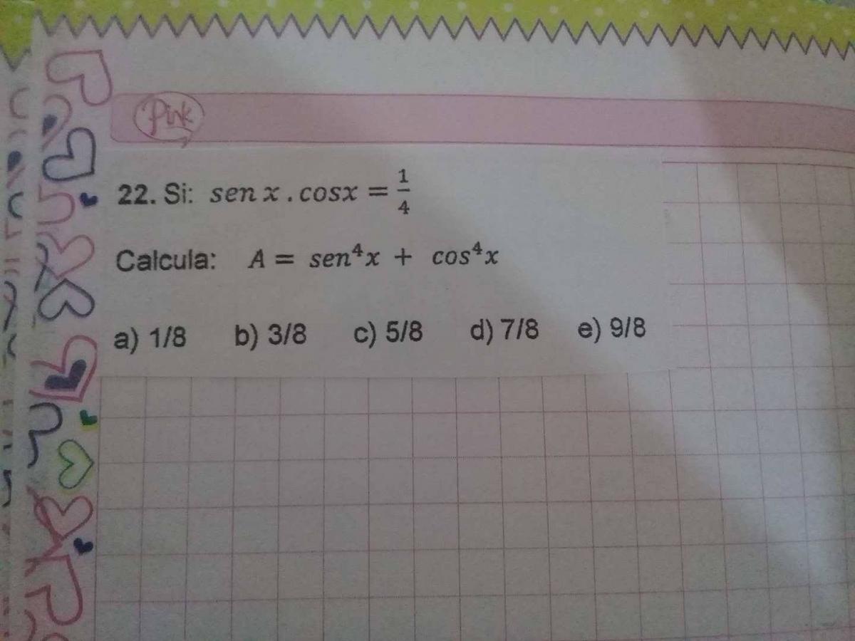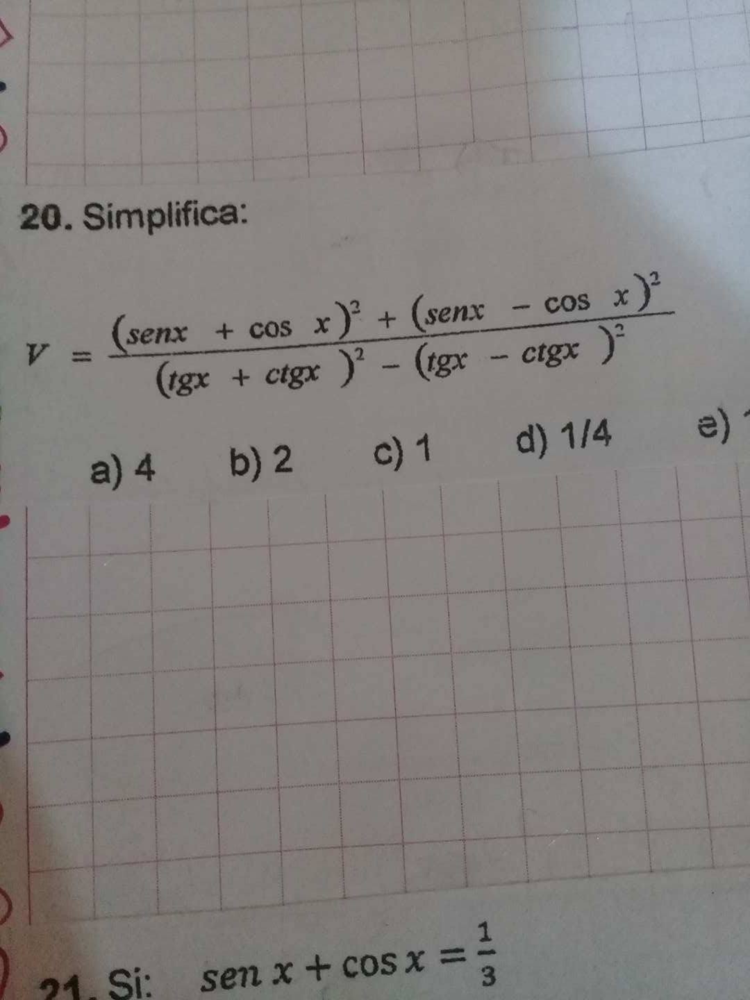 2. Comprueba si hay algún sen2x+cos2x , tienes que reemplazarlo por el número 1; porque sen2x+cos2x=1 (aunque no se dio el caso, en otros ejercicios similares puedes encontrarte con que necesites saber alguna de las otras razones trigonométricas)