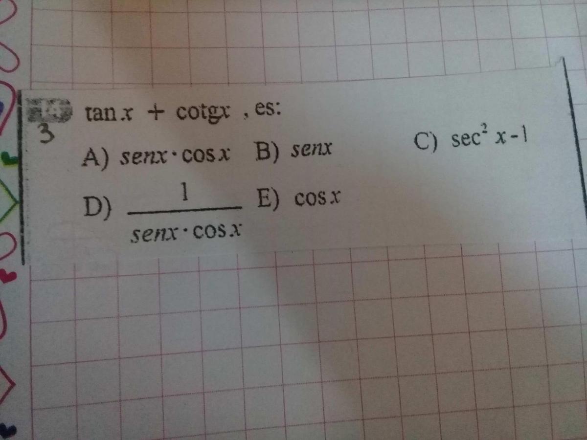 Para ello ten en cuenta que senx=senx, cosx=cosx, tgx= senx/cosx, 1/senx= cscx, 1/cosx= secx, 1/tgx= ctgx